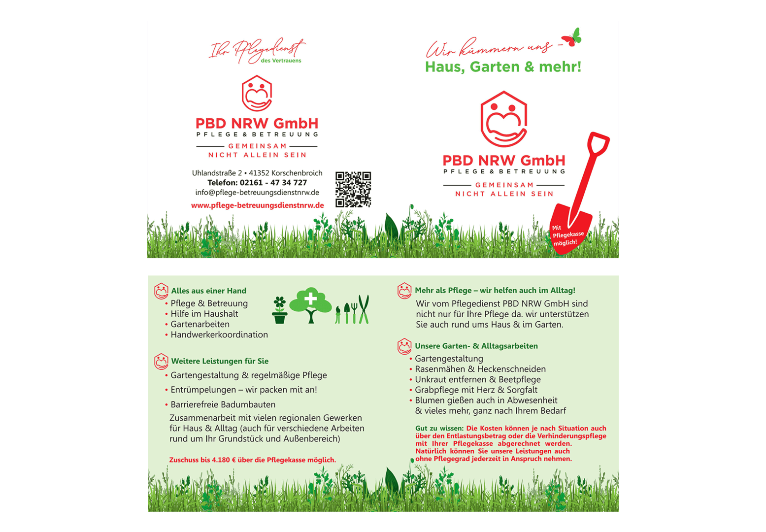 Unser Gartenservice im Überblick – zuverlässig, professionell und kompakt erklärt. Jetzt als Flyer downloaden und mehr erfahren – entdecken Sie auch unsere Verhinderungspflege.